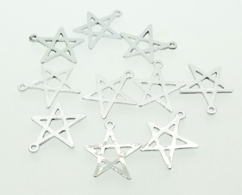 A pack of ten five pointed silver plated star charms each measuring approx 18x21x1mm.
