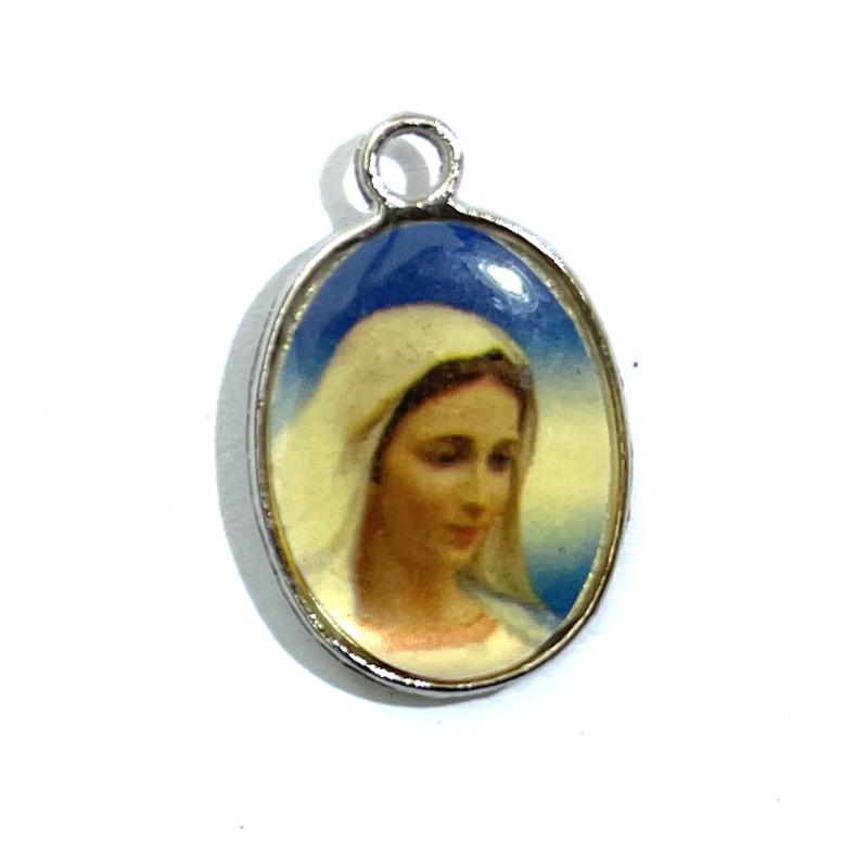 A single, double sided, base metal Rosary charm, from Rome Italy with a ring for attaching components, measures approx 24x15x3mm (suitable for Rosary making).