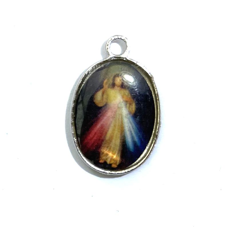 A single, double sided, base metal Rosary charm, from Rome Italy with a ring for attaching components, measures approx 24x15x3mm (suitable for Rosary making).