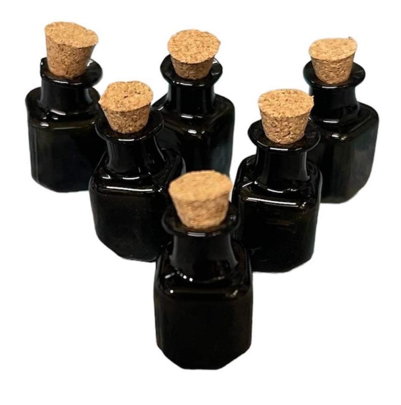 A single mini empty black coloured glass, square shaped charm bottle, approx. size 23x14x14mm with a 4mm opening. Each bottle has a cork stopper.