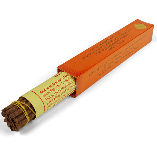 Handmade according to a centuries old formula from ancient Tibetan medical texts, this incense was said to be used for the treatment of altitude sickness as well as an aid to relaxation and meditation. Tibetan incense is different from other styles because it is not composed of a mixture of essential oils but instead from a combination of precious woods mixed with other natural ingredients found in the Himalayan region. This gives the incense a deep, rich, earthy aroma rather than being overly perfumed.