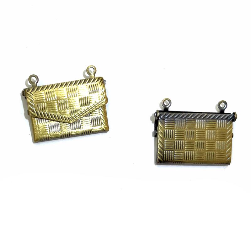 A pack of two brass metal purse charms, with 2 hanging rings each measuring approx 21x13x4mm (the purse has a hinged opening).