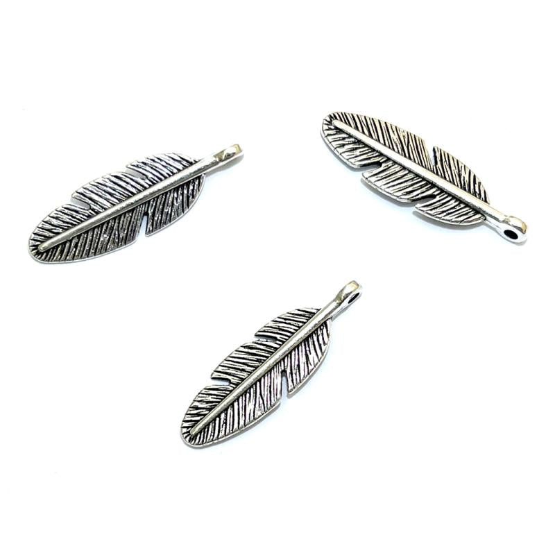 A pack of three base metal feather charms with 1 ring at the top for attaching components, each measures approx 29mm long.