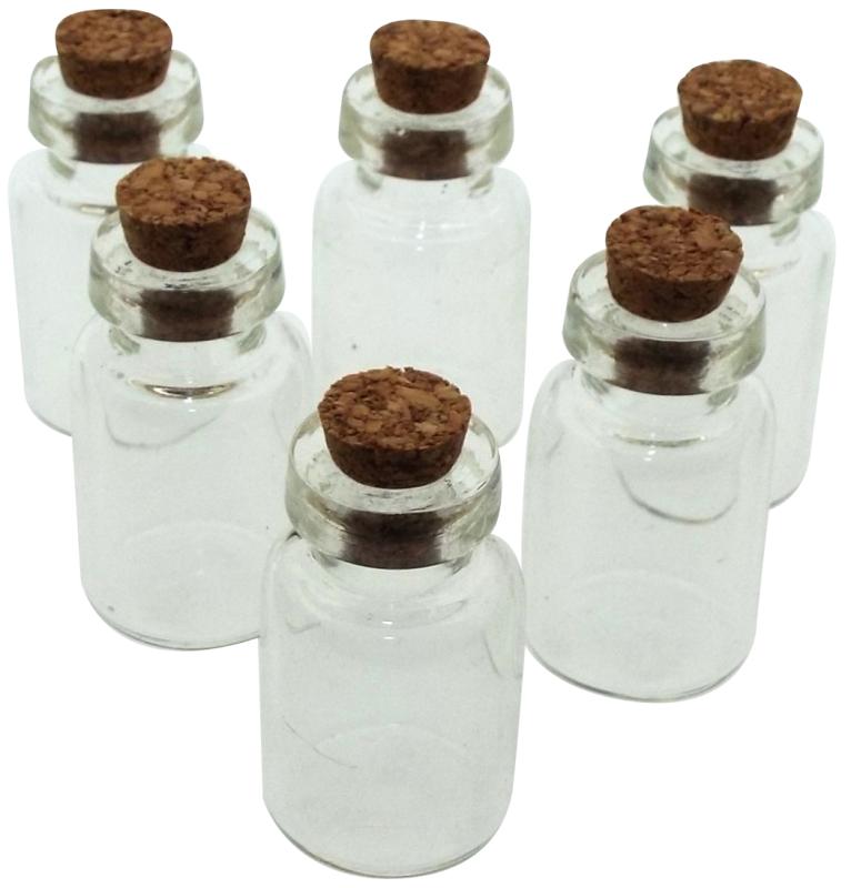 A set of six tiny empty clear glass bottles, approx. size 13x23mm with a 4mm opening. Each bottle has a cork stopper.