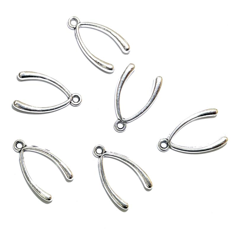 A pack of six base metal wishbone charms with 1 ring at the top for attaching components, each measures approx 23mm long.