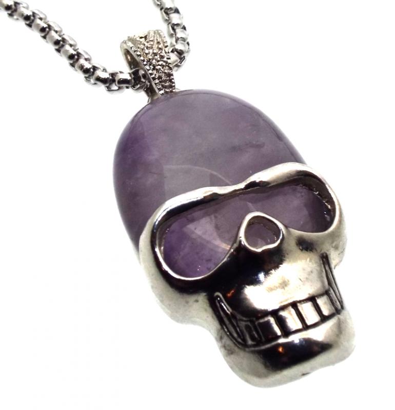 A metal skull design with an Amethyst cabochon, necklace with 24 inch metal chain that has a lobster claw fitting. Approx size 48x22mm.