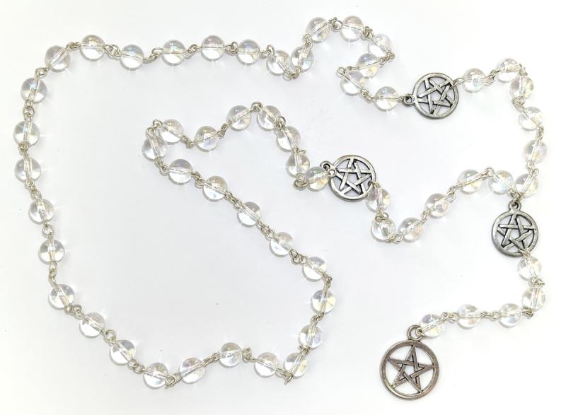 20 inch long Platinum coated bead, pentacle design, rosary style necklace.
