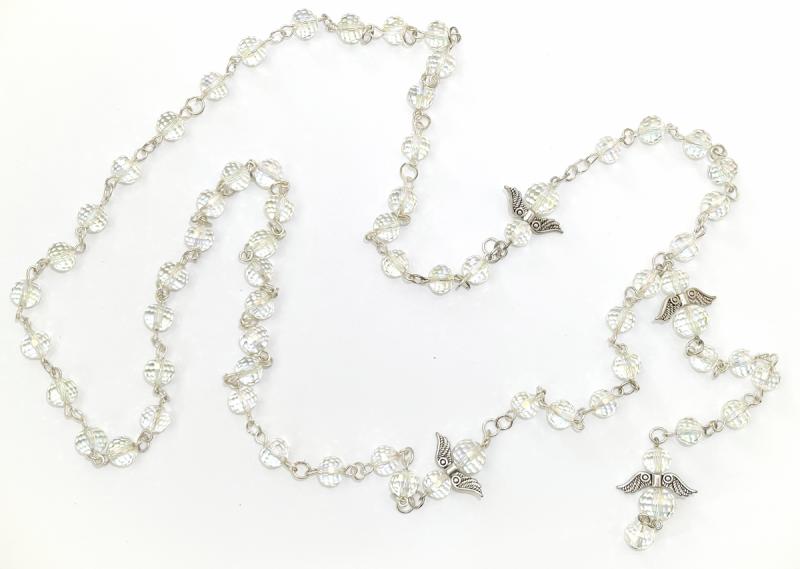 20 inch long Platinum coated bead, angel design, rosary style necklace.