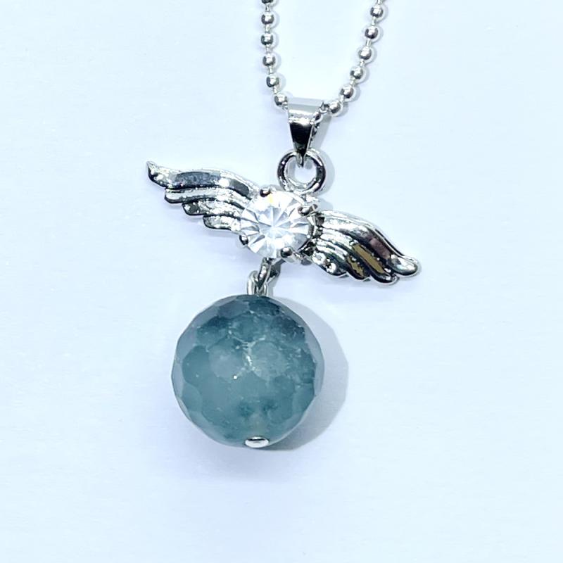 A 12mm Green Quartz bead and angel wing pendant with crystal. Complete with a 20inch ball chain, measures Approx 24x33mm.