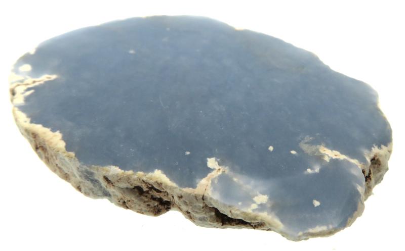 A natural Angelite specimen sliced thin and polished on one side, measuring approx 66 mm long x 49 mm wide x 8 mm depth