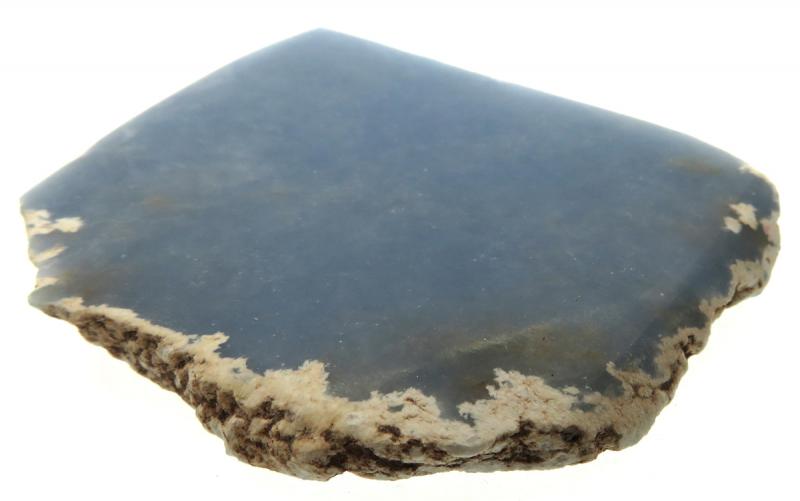A natural Angelite specimen sliced thin and polished on one side, measuring approx 64 mm long x 47 mm wide x 6 mm depth