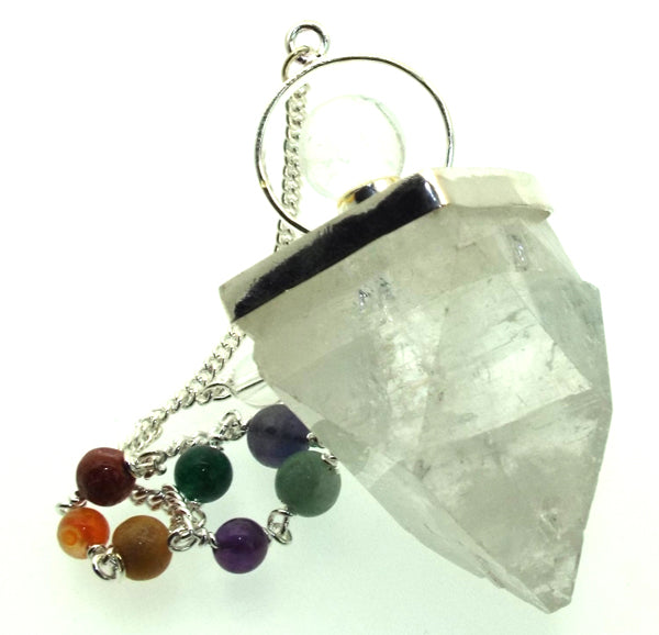 The Pendulum is attached to a chain which features little gemstones relating to the chakra system which are Clear Quartz, Amethyst, Aquamarine, Iolite, Green Aventurine, Yellow Calcite, Carnelian and Red Jasper.