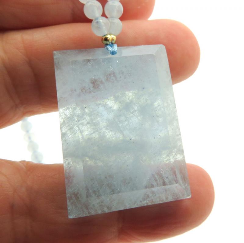 Aquamarine adjustable beaded necklace with a carved genuine Aquamarine slab measuring 36mm long x 21mm wide x 6mm deep.
