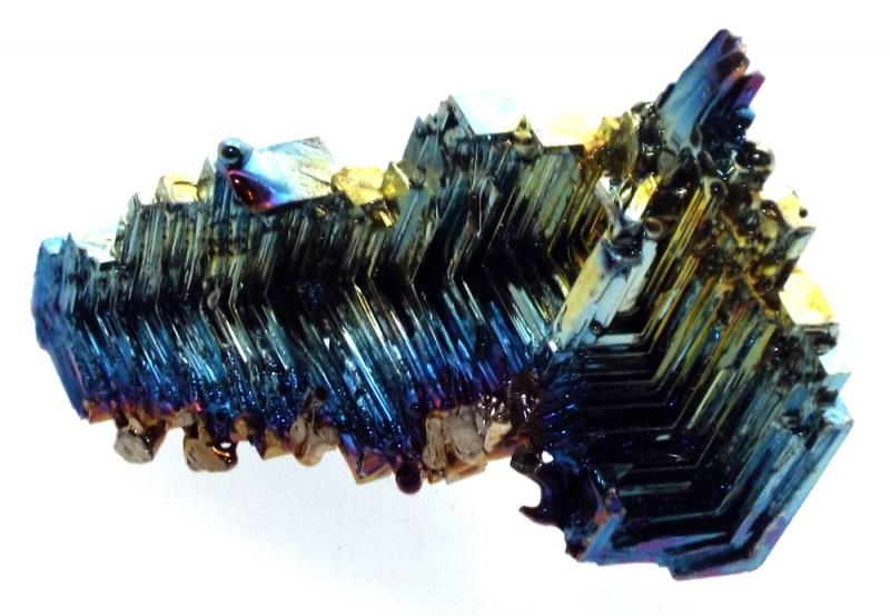 Bismuth is a brittle metal used in the medical and beauty industries. The metal is heated and oxidised in a lab to form the amazing patterns and rainbow colours.