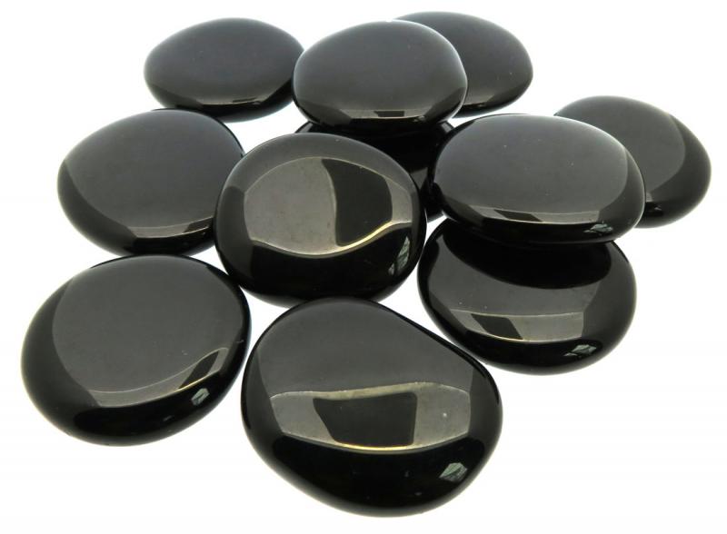 A flat Black Obsidian palmstone measuring approx 35mm to 40mm wide, this may vary slightly.
