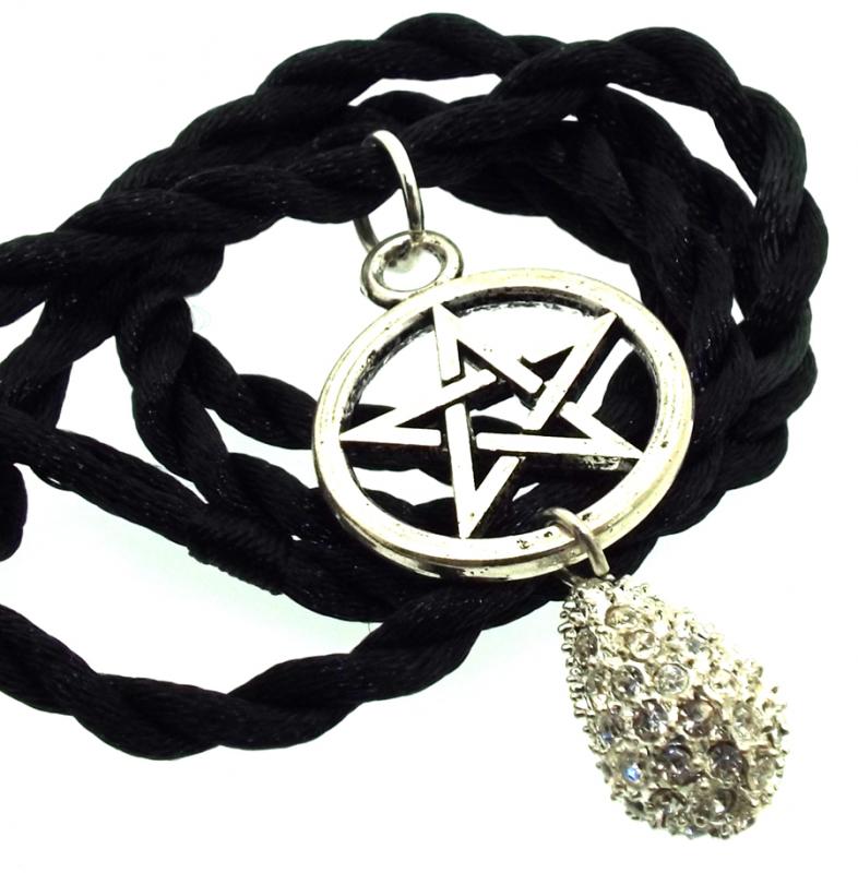 Measures Approx 20x45mm a metal pentacle with hanging 14mm long bling crystal droplet, supplied with a short knot and loop fastening 18inch twisted cord.