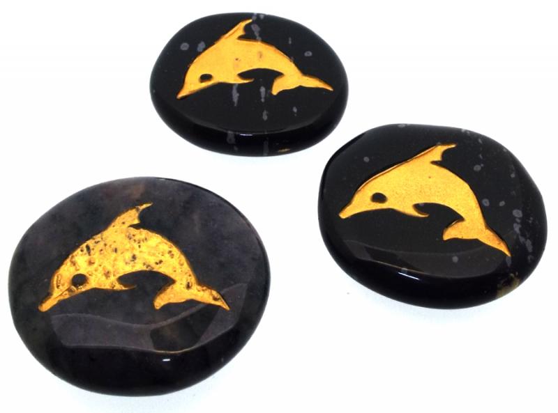 Carved Dolphin animal totem stone for harmony, communication and trust. A random carved gemstone talisman supplied with a velvet carrying pouch and card. Stone size 30x30mm approx.