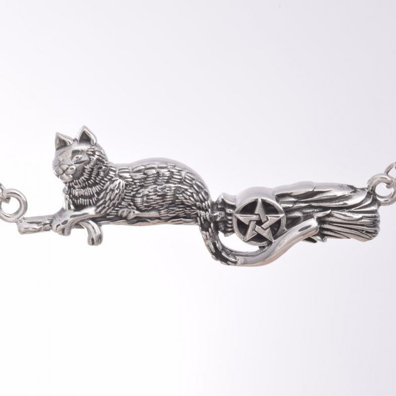 Cat on Broomstick Pentacle Sterling Silver Necklace
