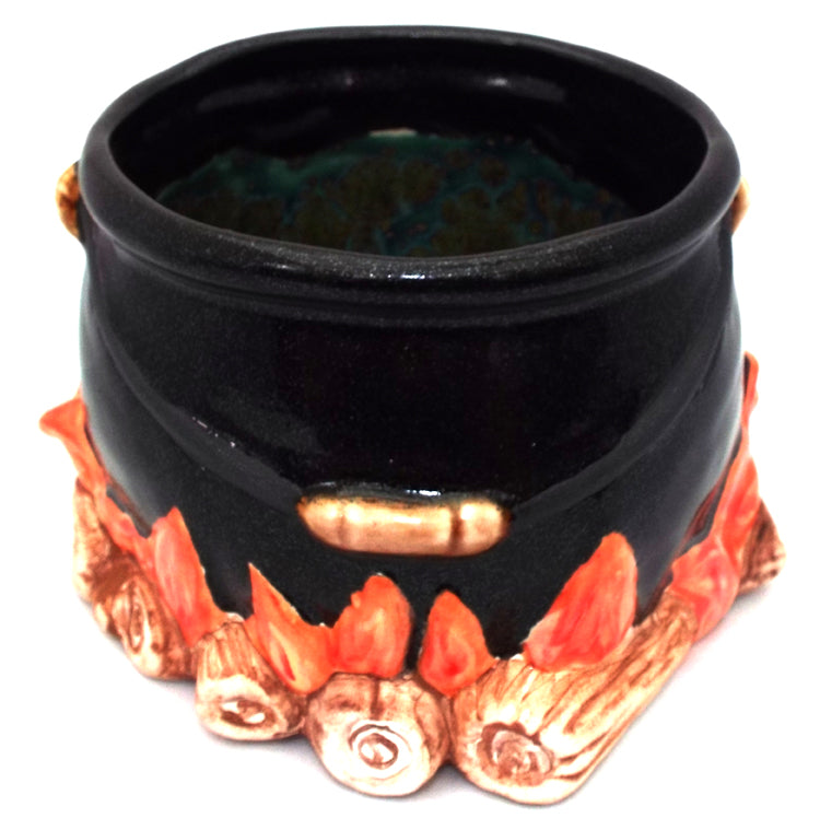 A small, locally hand crafted, part glazed, cauldron shaped ceramic burner for incense cones or incense. Measures approx 85mm wide by 73mm tall.
