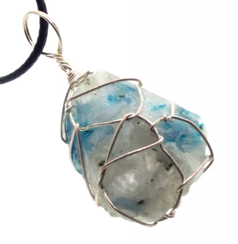 A Cavansite Gemstone wire wrapped in a simple secure net of silver plated anti tarnish wire.