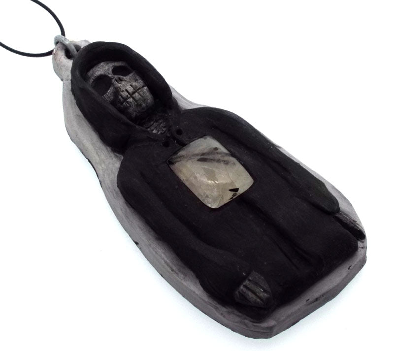 A locally hand crafted ceramic grim reaper with a Tourmalated Quartz cabochon. Measures approx 43mm wide by 100mm tall.