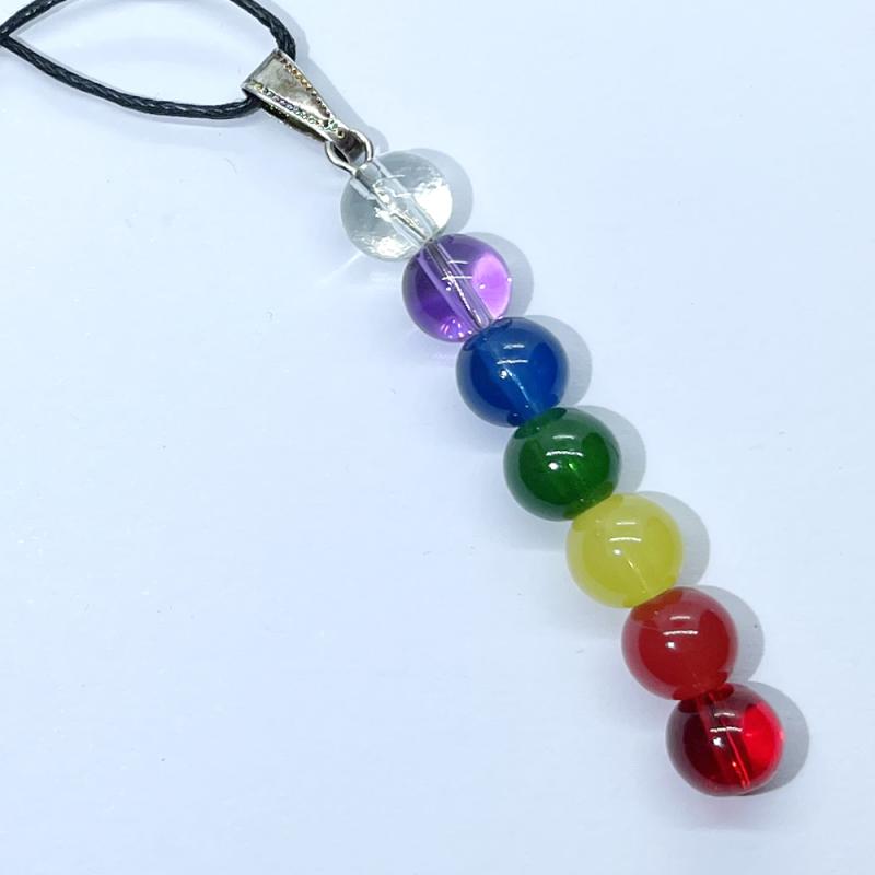 Measures Approx 50x8mm with 8x8mm smooth crystal glass beads representing the Chakra colours.