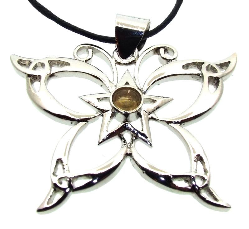 Butterfly design metal pendant with Gemstone detail, supplied with a long waxed cotton cord. Approx size 37x30mm.