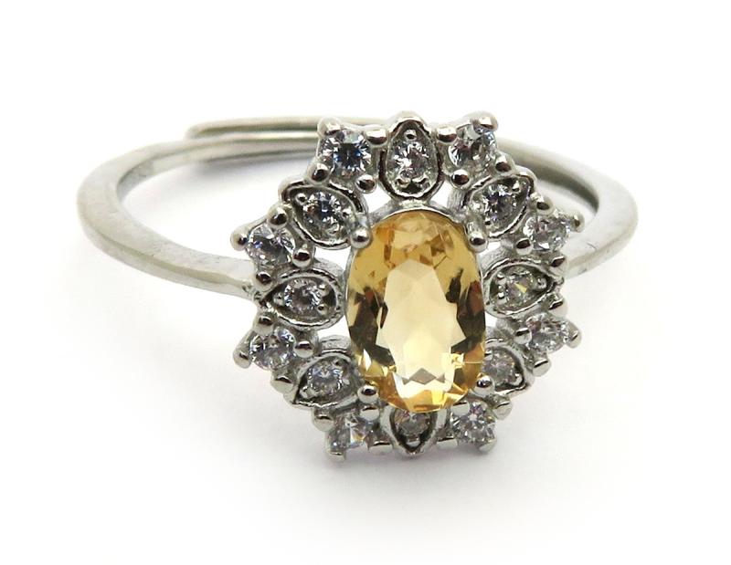 Citrine silver plated ring that adjusts to fit a variety of sizes. Standard diameter uncoiled is 18mm.