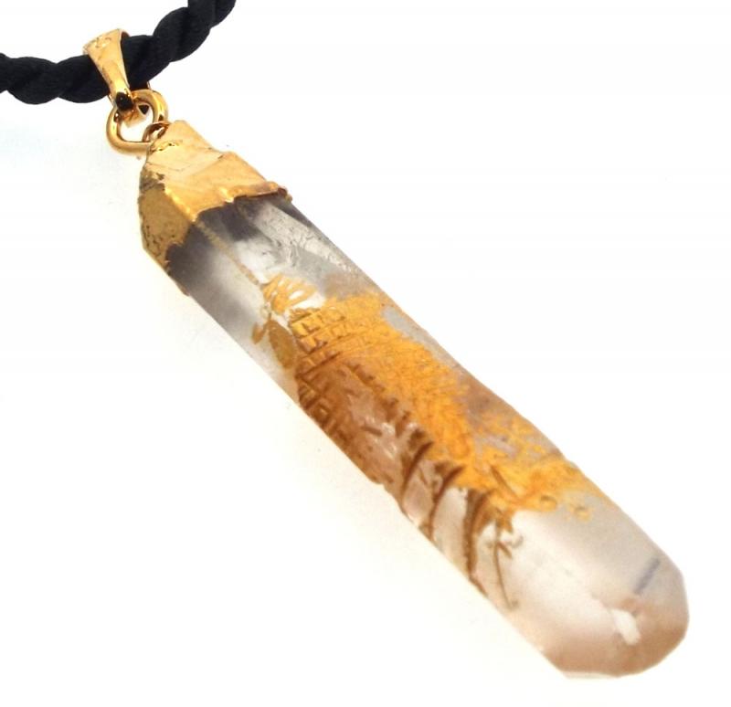 A Quartz point pendant hand carved with a dragon design, measuring 52 mm long x 9 mm wide x 8 mm high, the top is electroplated with gold coloured metal.