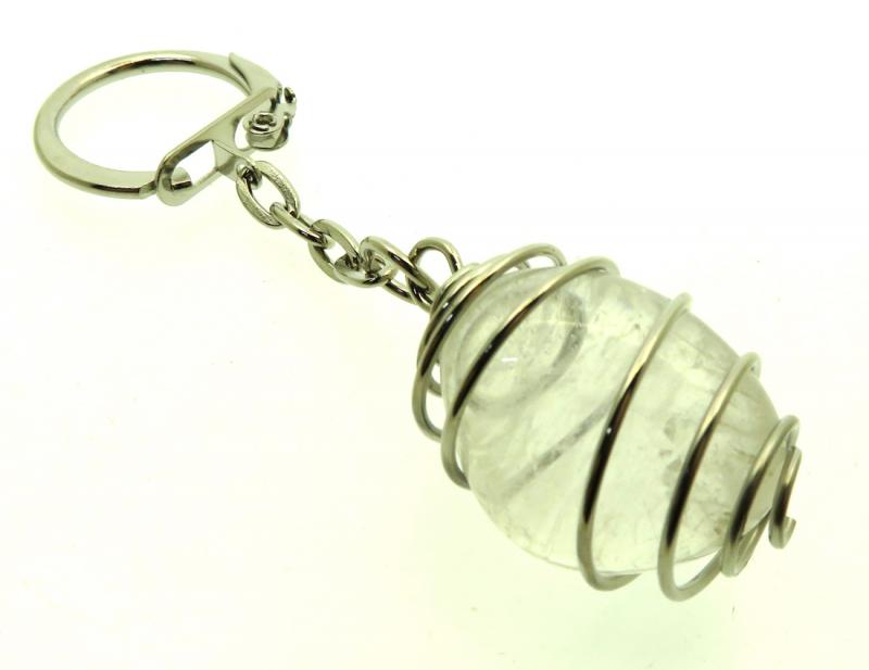 A genuine Clear Quartz tumblestone in a silver plated metal spiral. The keyring measures 20x35x20mm and is supplied with a standard keyring fitting.