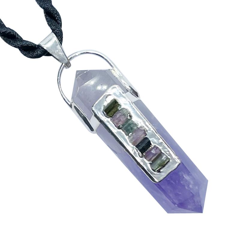 An absolutely stunning Amethyst double terminated point pendant with inlaid Watermelon Tourmaline Gemstones. Supplied with a short knot and loop fastening cord.