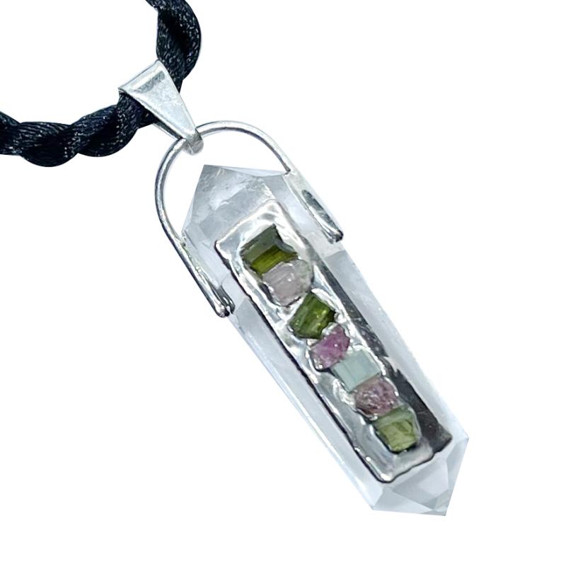 An absolutely stunning Quartz double terminated point pendant with inlaid Watermelon Tourmaline Gemstones. Supplied with a short knot and loop fastening cord.