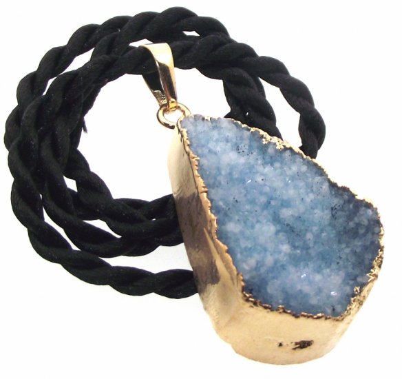 An absolutely stunning Blue Quartz Druzy crystal pendant supplied with a short 18 inch black twisited thong.