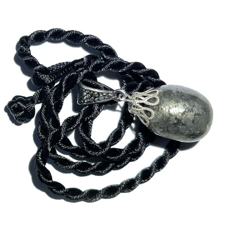 Golden Pyrite nugget pendant, supplied with a short knot and loop fastening cord. Measures Approx 40x15mm.