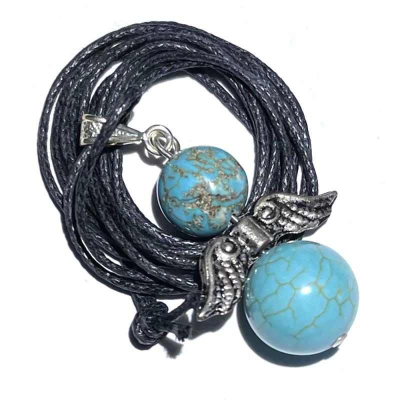 10 mm and 12 mm Sinkiang Turquoise beads make up this Angel design pendant, supplied with a long waxed cotton cord. Measures Approx 20x30mm.