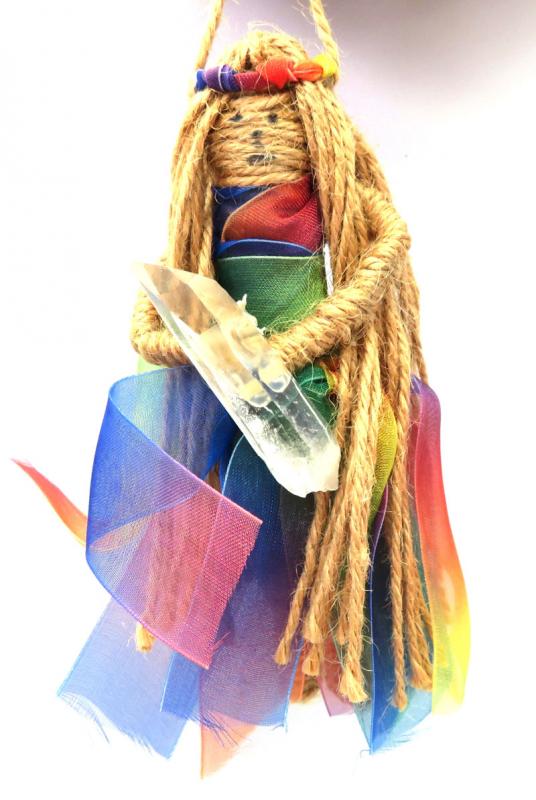 A hanging crystal keeper doll, hand crafted by Angelleesa from natural materials, with its own Quartz Crystal. Measures approx 12cm (5inches) tall.