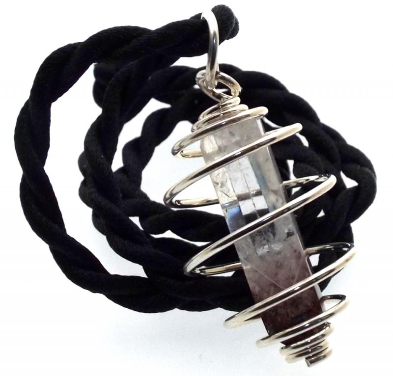 Silver plated spiral cage containing a natural Harlequin Quartz Crystal, which is Quartz with beautiful red inclusions of Lepidocrocite.
