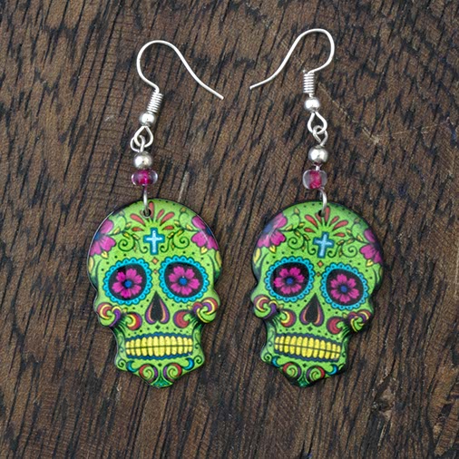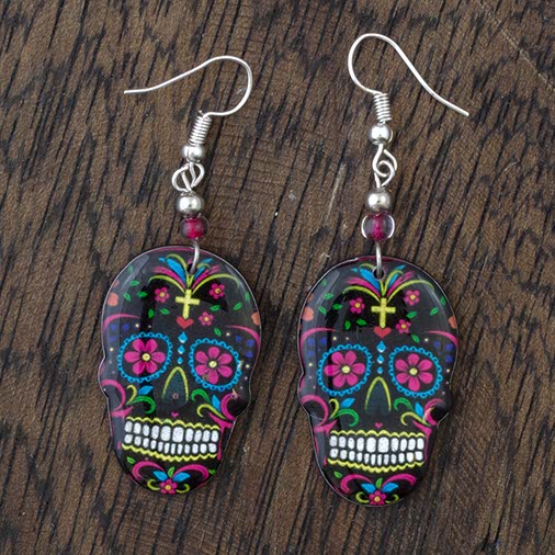 These fascinating and colourful big earrings are associated with the Latin American 'Day of The Dead.' The calaveras (Spanish for 'skull') are similar in style to the artwork and iconography of this fascinating holiday.