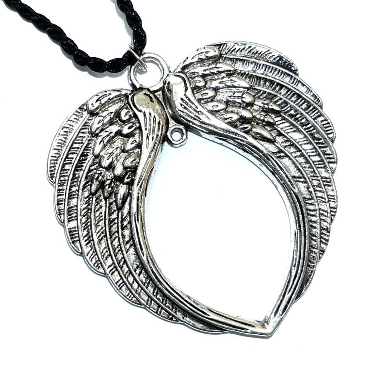 A metal angelwing pendant supplied with a short knot and loop fastening cord. Approx size 71x67x4mm.