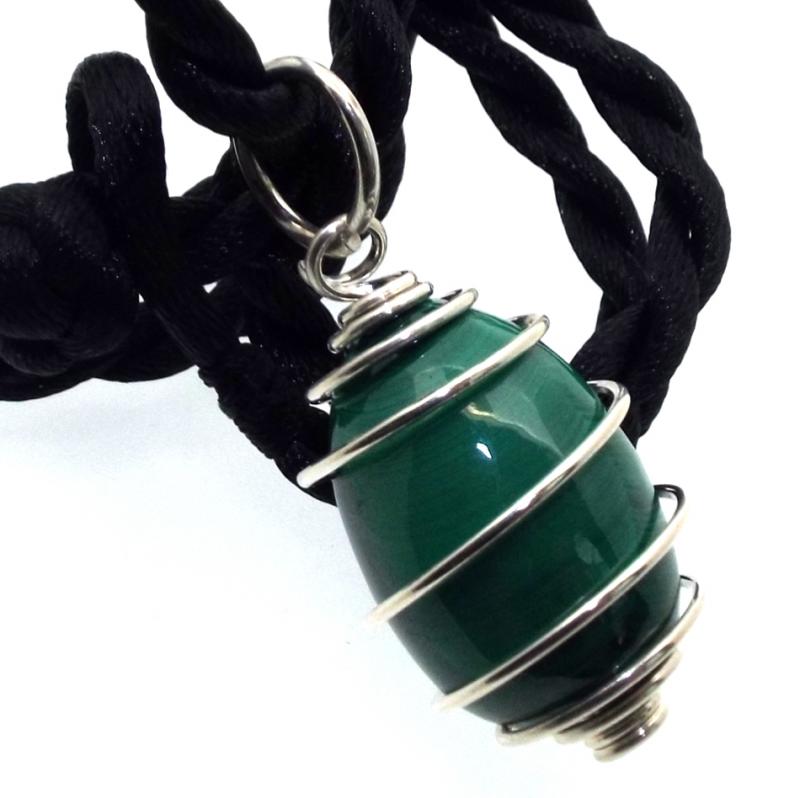 The pendant measures 30 mm long x 15 mm wide and is supplied with a short twisted knot and loop fastening cord. Silver plated spiral cage containing a medium Malachite egg.