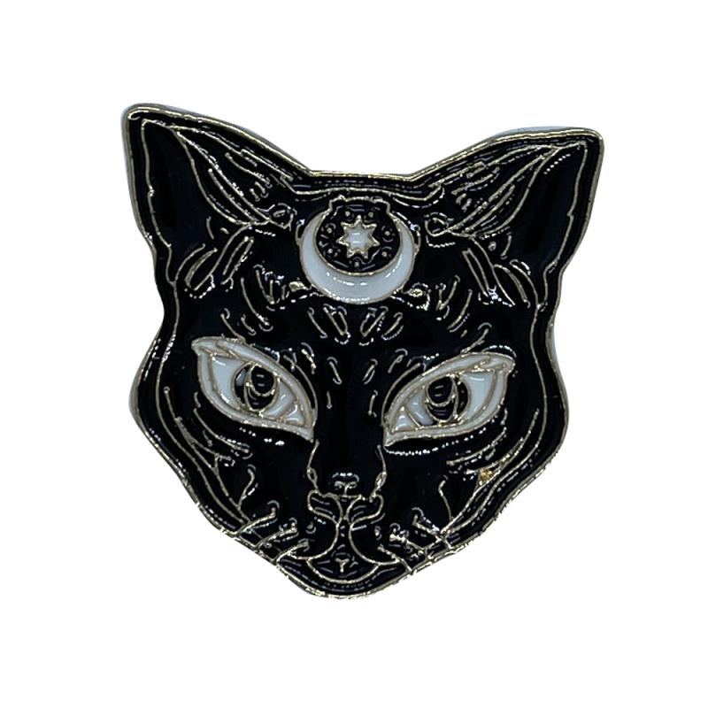 Metal badge with a cat face design enhanced by enamel, that measures 35x38mm approx.