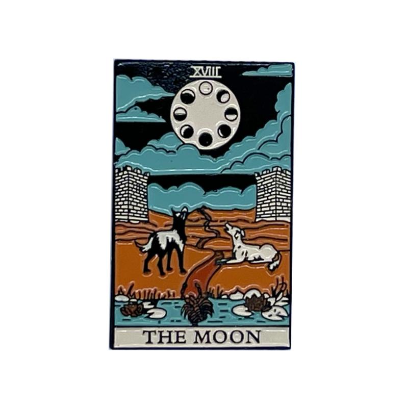 Metal badge with a Moon design enhanced by enamel, that measures 30x20mm approx.