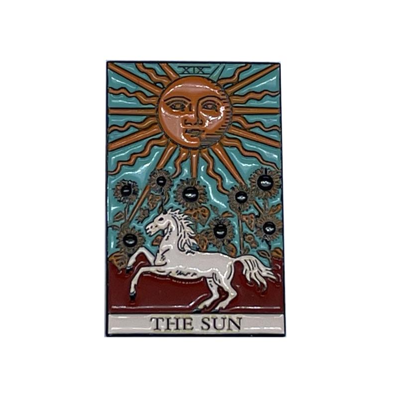 Metal badge with a Sun design enhanced by enamel, that measures 30x20mm approx.