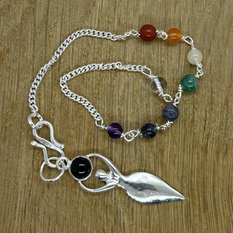 The Pendulum is attached to a 7inch chain, which features little gemstones relating to the chakra system which are Clear Quartz, Amethyst, Aquamarine, Iolite, Green Aventurine, Yellow Calcite, Carnelian and Red Jasper.
