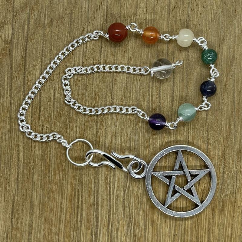 The Pendulum is attached to a 7inch chain, which features little gemstones relating to the chakra system which are Clear Quartz, Amethyst, Aquamarine, Iolite, Green Aventurine, Yellow Calcite, Carnelian and Red Jasper.
