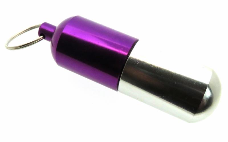 Metal two piece screw together stash tin with water resistant rubber seal, measures approx 85x25mm with a standard keyring fitting.