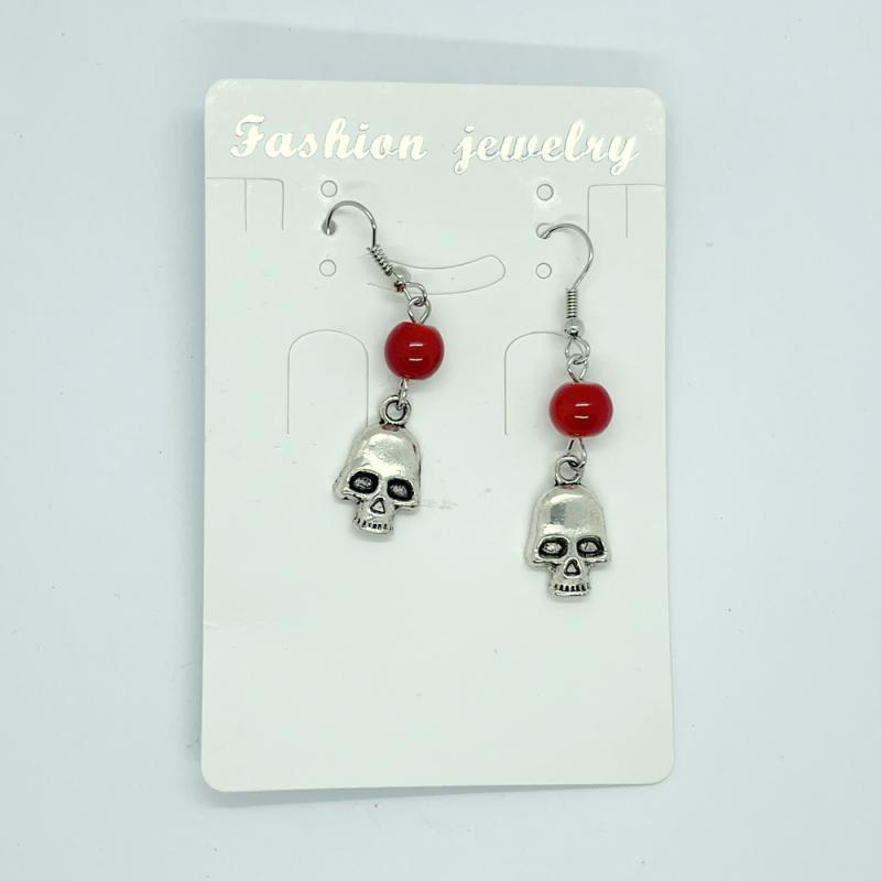 An affordable pair of metal skull design, 8mm beaded dropper earrings, with fishhook fittings. Measures approx 35x12mm.