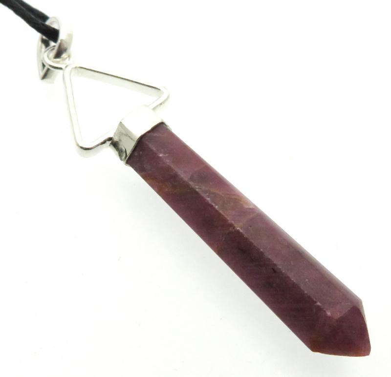 A faceted Ruby point pendant that measures Approx 12x53mm. Supplied with a long waxed cotton cord.