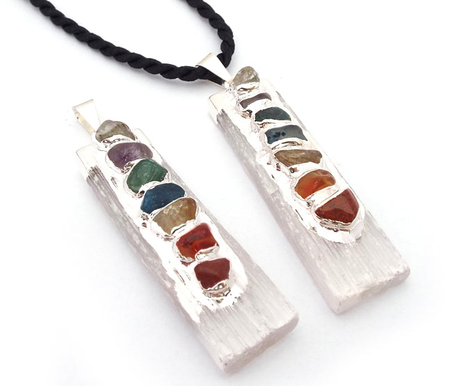 The Selenite top has been electroplated with Silver coloured metal securely bonding it to the Crystal. The pendant has real tiny crystals representing the Chakra colours: Quartz, Amethyst, Aventurine, Aquamarine, Citrine, Carnelian and Red Jasper.