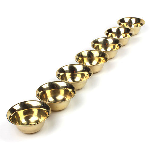Set of seven small water offering bowls made from metal. Water offerings (also known as 'yonchap' in Tibetan) are amongst the most common forms of offering at Buddhist shrines. One reason why water is offered is because it has traditionally been considered a plentiful substance in Tibet and we should be seeking to make all offerings as freely as we would give water.